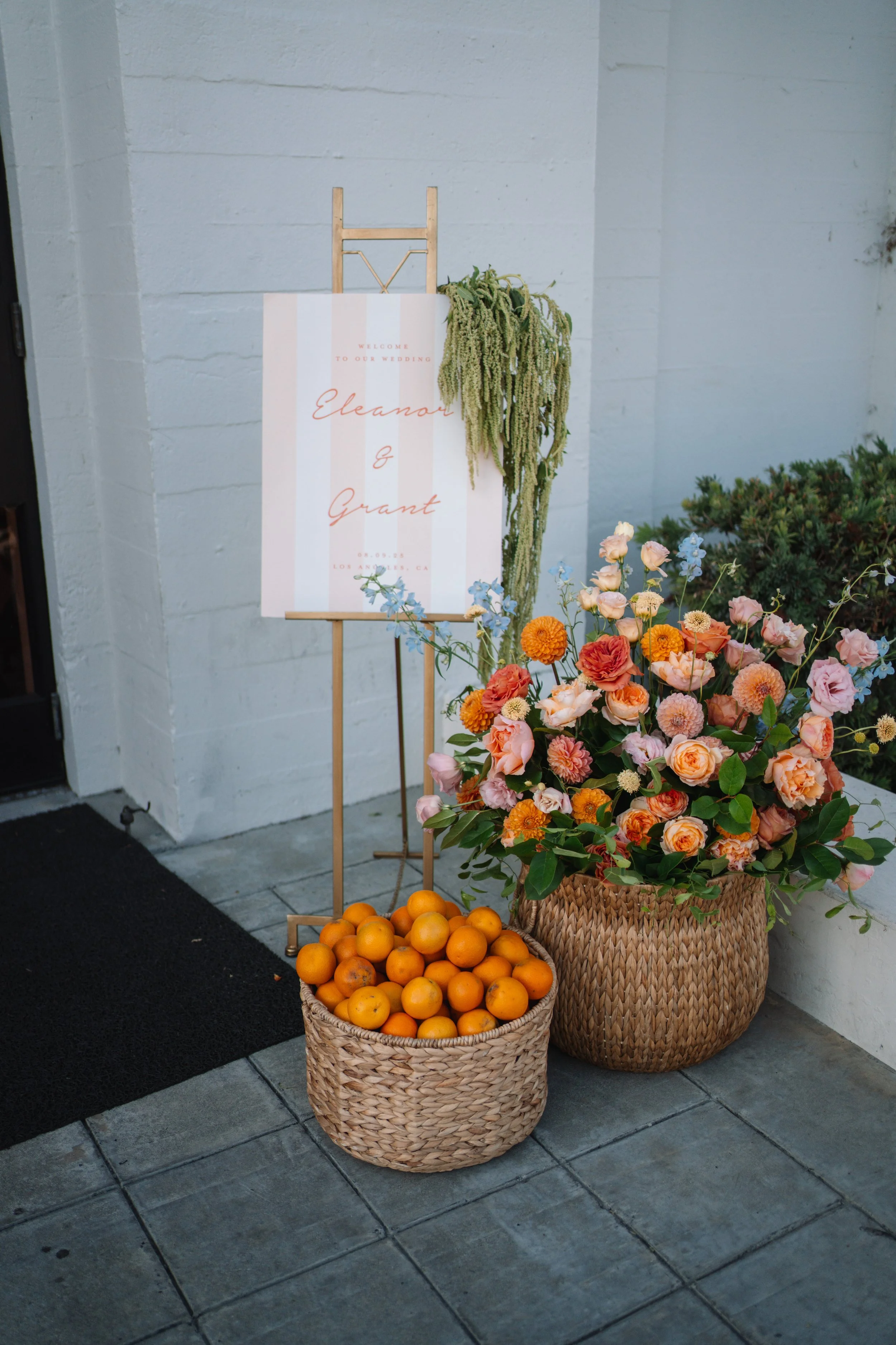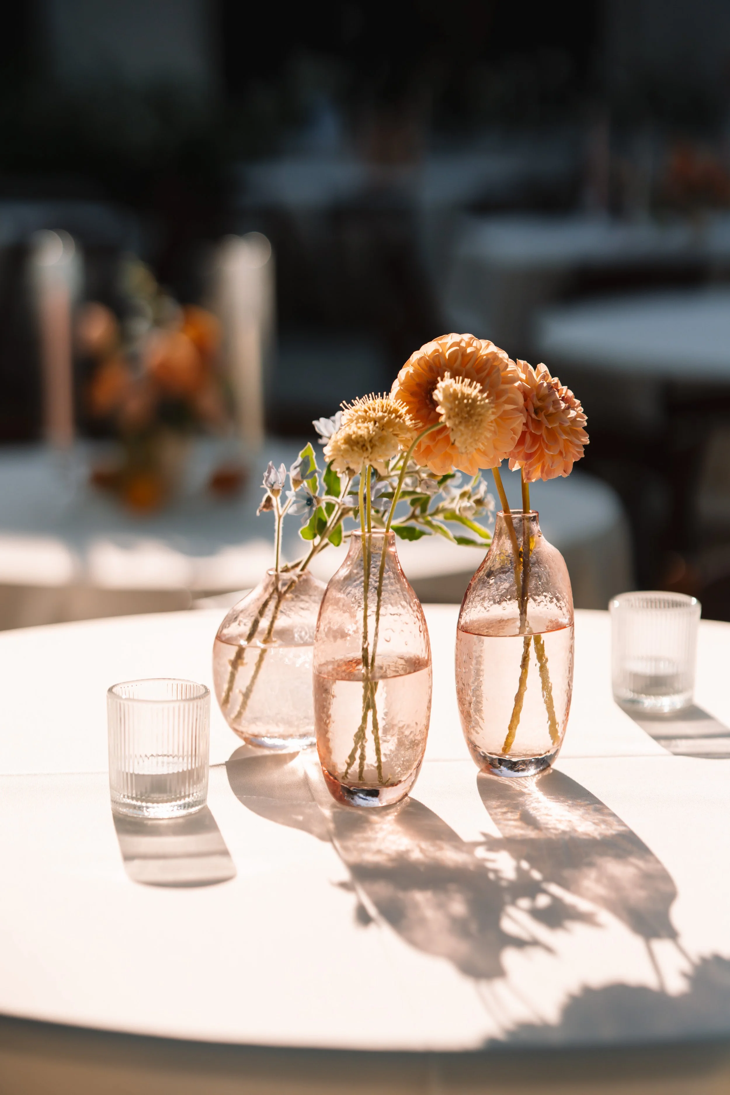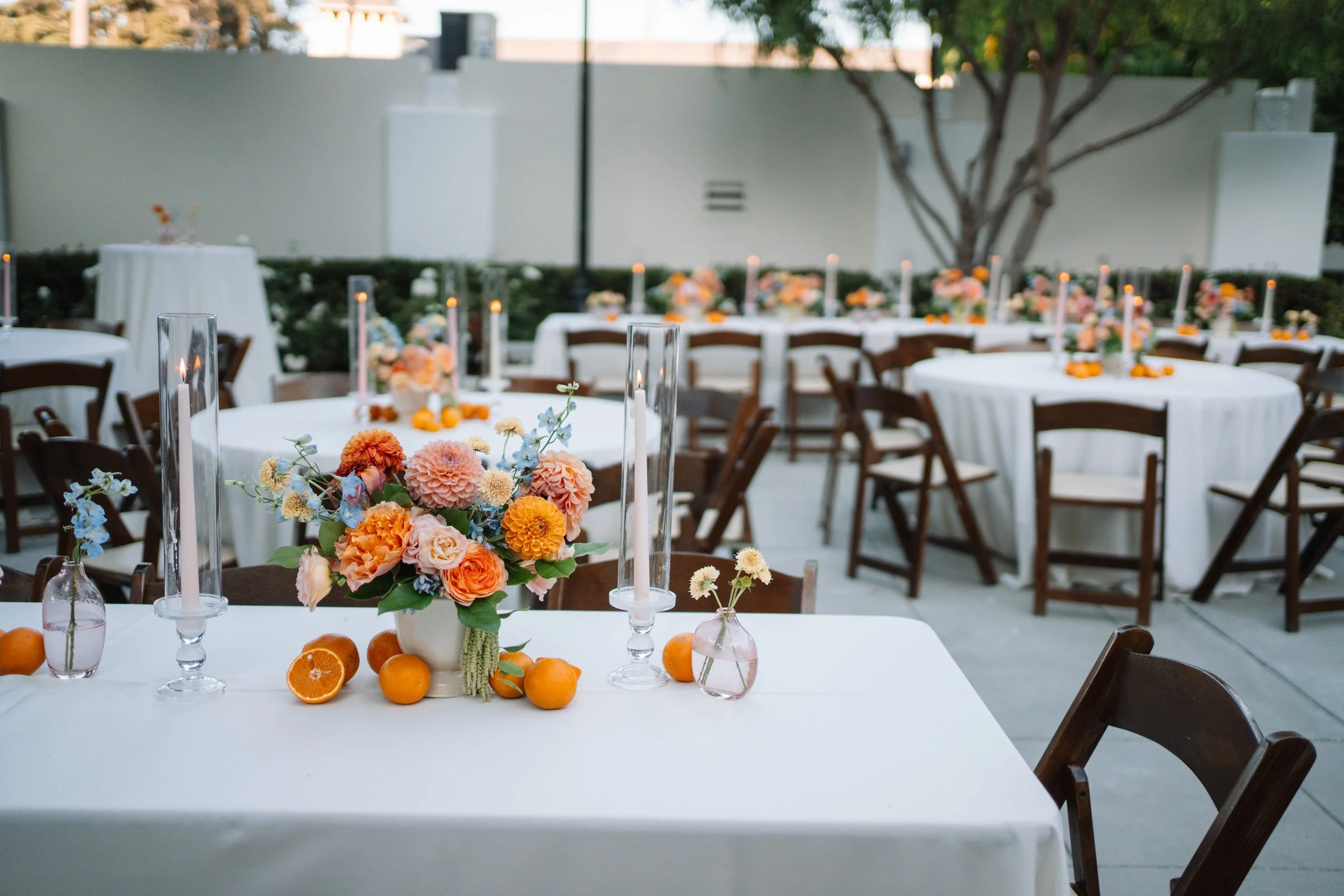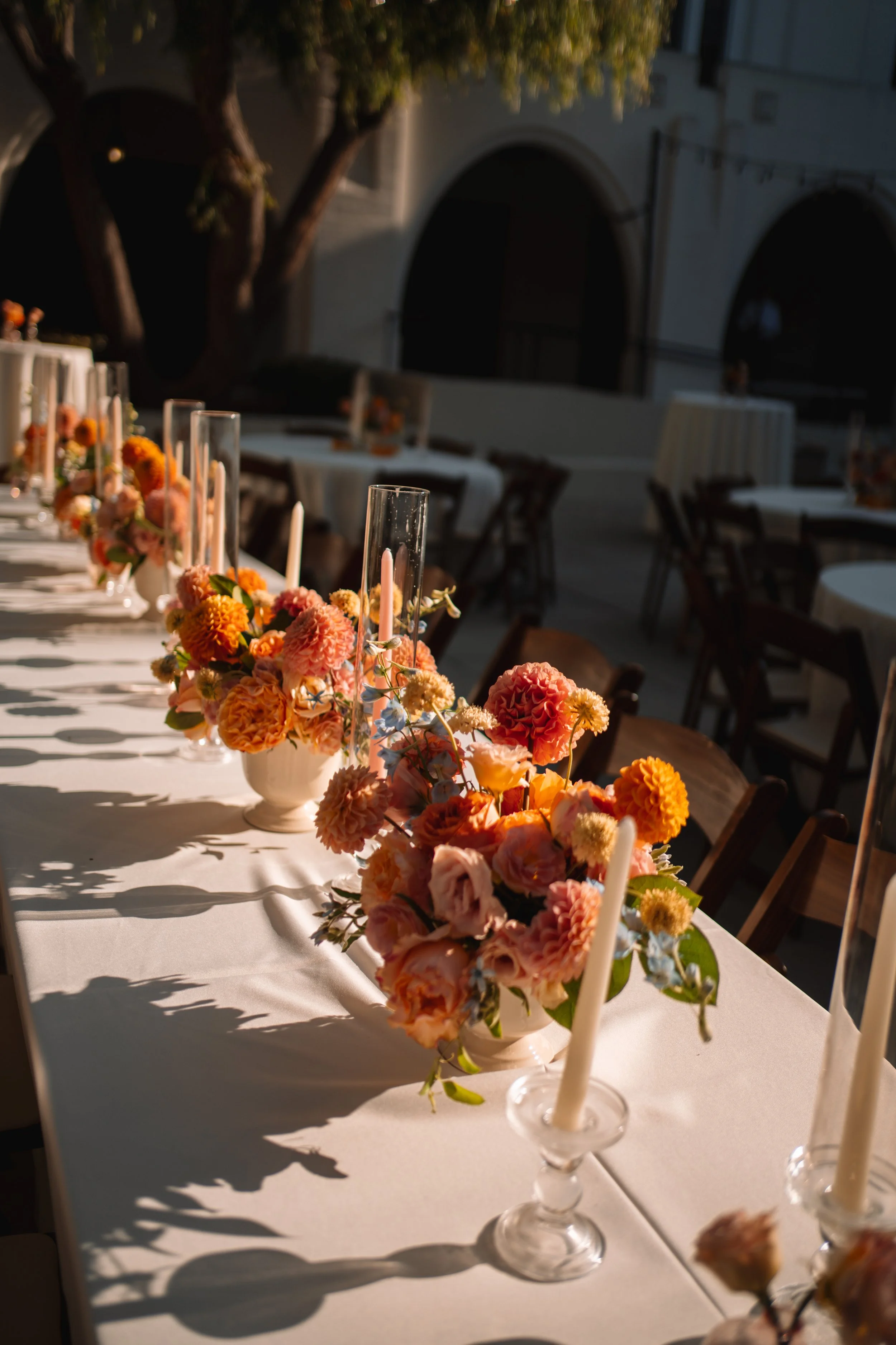 A palette of apricot, peach, and coral blooms accented with soft blue florals brings warmth, depth, and a hint of playfulness to the tablescape. Layers of dahlias, roses, and delicate seasonal blooms create a soft, textural arrangement that captures the golden warmth of the California light.